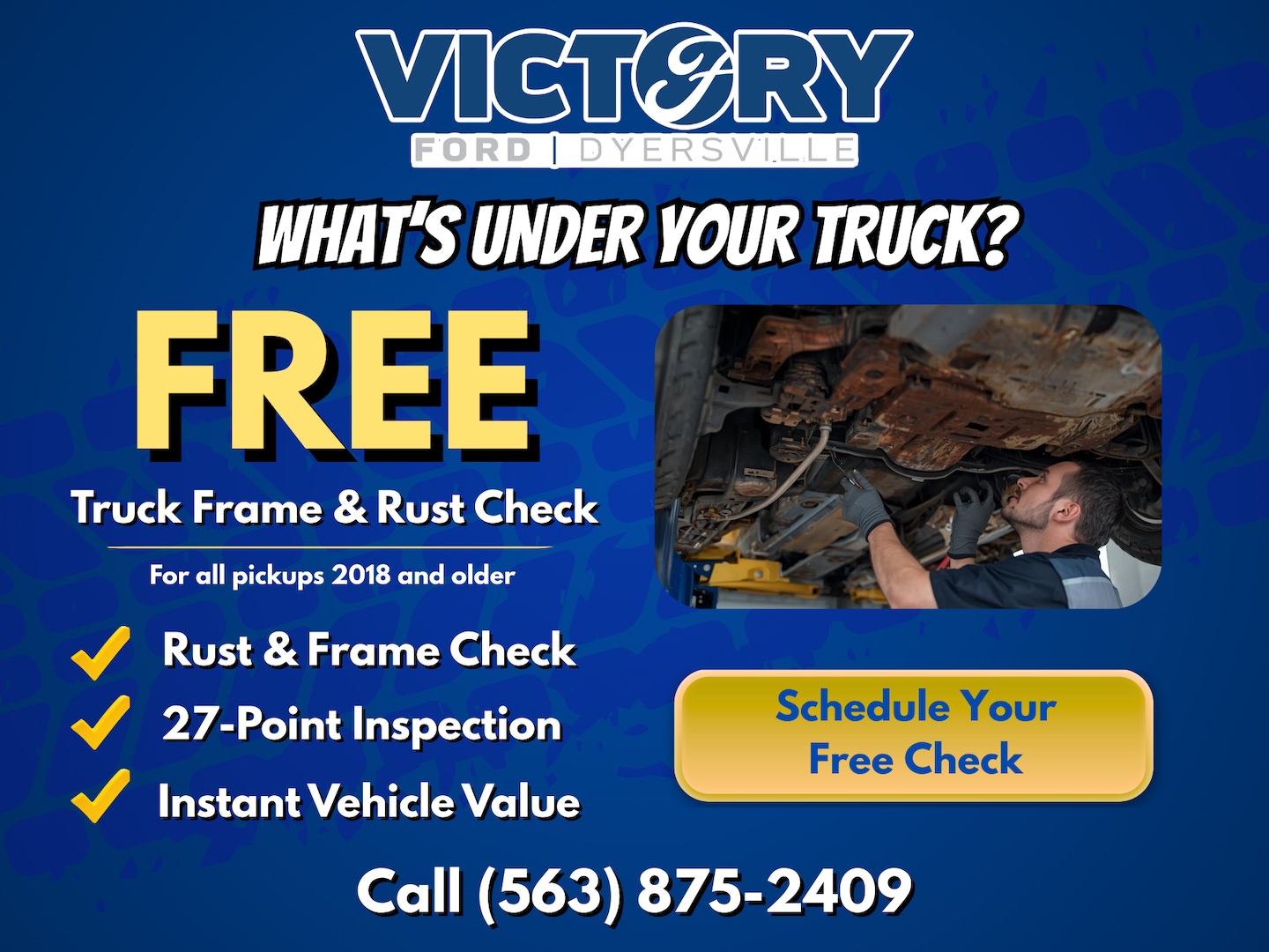 Just give us a call and ask for our FREE Rust & Frame Check. We'll put your truck on a lift, inspect the frame and underbody, and clearly explain what we see.